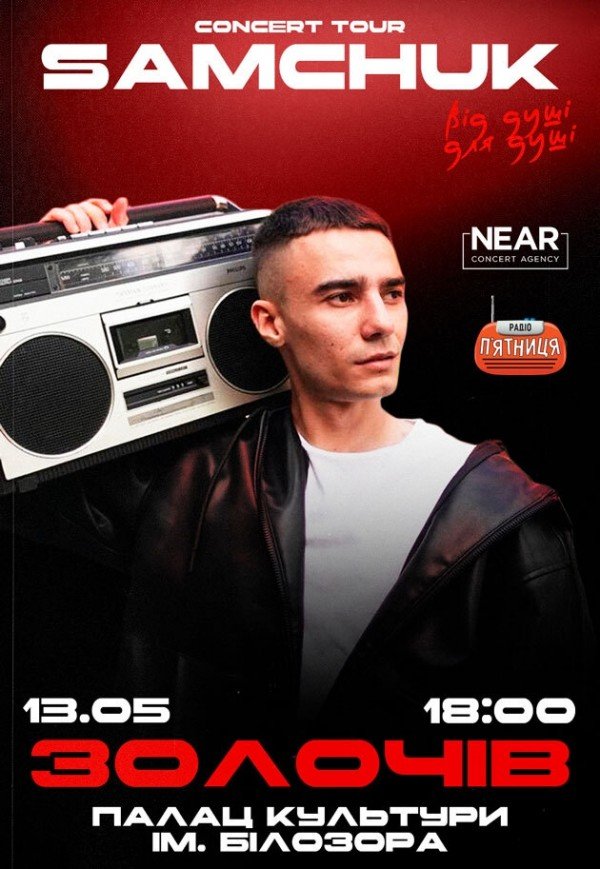 Samchuk відбудеться 13 травня 2026, 18:00, середа в Палац культури ім. І. Білозора (Львівська обл.). За допомогою сервісу internet-bilet.ua, Ви зможете з легкістю забронювати, замовити та купити квитки на концерт, спектакль, оперу, балет, майстер-класи, спортивні та дитячі заходи, що Вас цікавлять, оплативши їх найбільш зручним для Вас способом: через інтернет банківською карткою VISA/MasterCard, готівкою або кур'єром, якщо зробите замовлення квитка з доставкою.